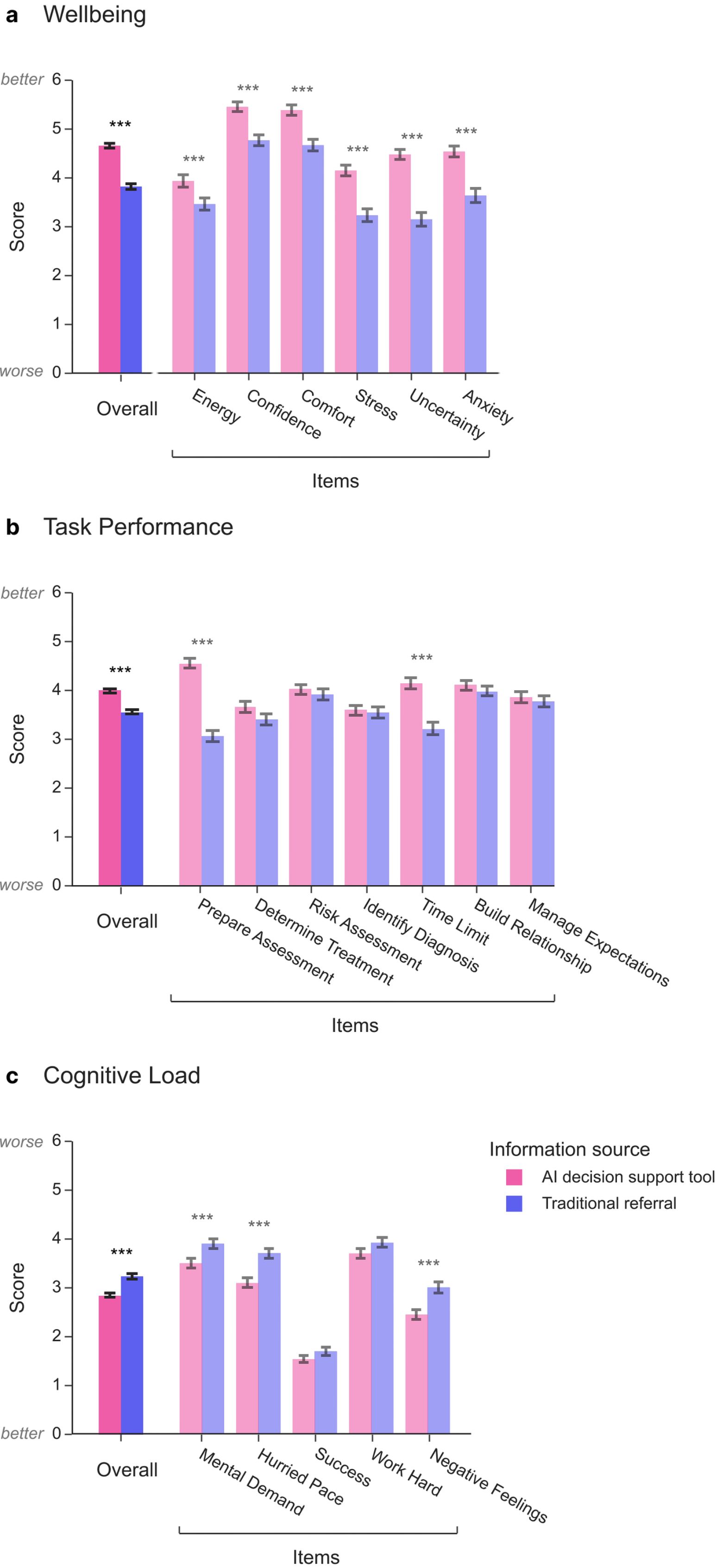Relative to traditional methods, assessments supported by information provided by the AI tool were associated with significantly higher clinician wellbeing and task performance, and significantly lower cognitive load, irrespective of the clinician’s experience. These benefits were magnified by workload.
